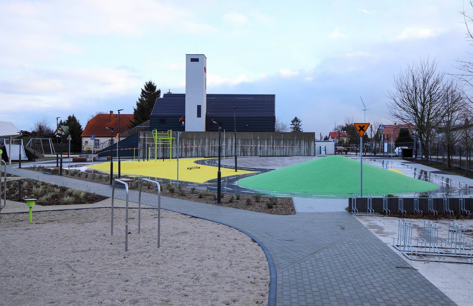 – przestrzeń dla młodzieży wyposażona w tor rowerowy, urządzenia do ćwiczeń, leżako-ławki, oraz mur do graffiti,